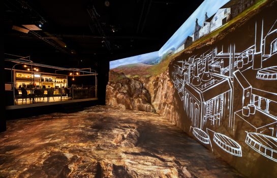 We built up 3D projection mapping with the usage of 18 projectors and zoom wide-angle lens. With the help of projection techniques, we made the dream come true: Three lost distilleries "Glenury Royal", "Port Ellen", "Brora" epically appeared in front of guests.